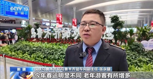 国铁乌鲁木齐局乌鲁木齐站车间副主任 张永健:今年春运明显不同,老年游客有所增多,我们成立了“天山雪莲”志愿者服务队,为有需要的旅客朋友提供疆内景点介绍等特色服务,全力为银发游客护航。