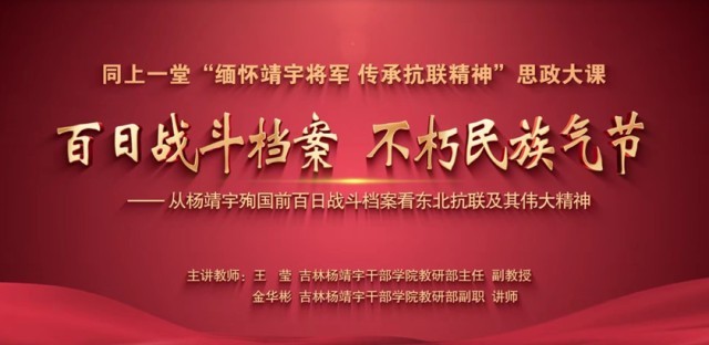 本次思政大课由中共吉林省委教育工委、吉林省教育厅、吉林杨靖宇干部学院联合人民网共同举办。吉林杨靖宇干部学院教研部主任、副教授王莹,吉林杨靖宇干部学院教研部副职、讲师金华彬担任主讲。课程以《百日战斗档案 不朽民族气节——从杨靖宇殉国前百日战斗档案看东北抗联及其伟大精神》为主题,带领全省学生回顾东北抗联历史,缅怀伟大的杨靖宇将军,深刻感悟东北抗联精神,汲取磅礴奋进力量。
