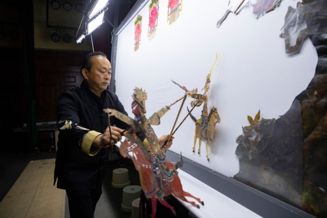 在位于阆中市的四川王皮影艺术博物馆,王彪为观众表演皮影戏《千里走单骑》(2月19日摄)。