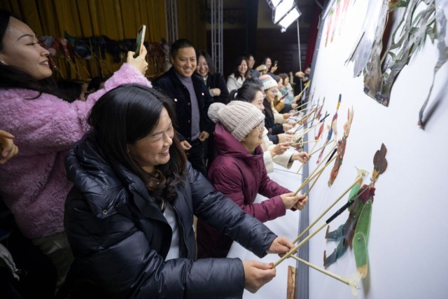 在位于阆中市的四川王皮影艺术博物馆,观众受邀上台体验表演皮影戏(2月18日摄)。