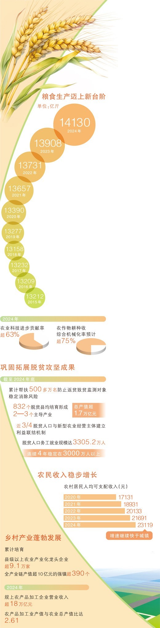 2024年,我国粮食产量首次超过1.4万亿斤,迈上历史性新台阶。食用植物油自给率进一步提高,绿色优质农产品供给持续增加。
