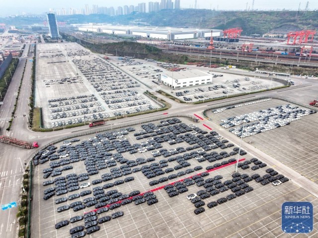 ↑ 这是2月25日拍摄的重庆两江新区果园港停放的商品车(无人机照片)。