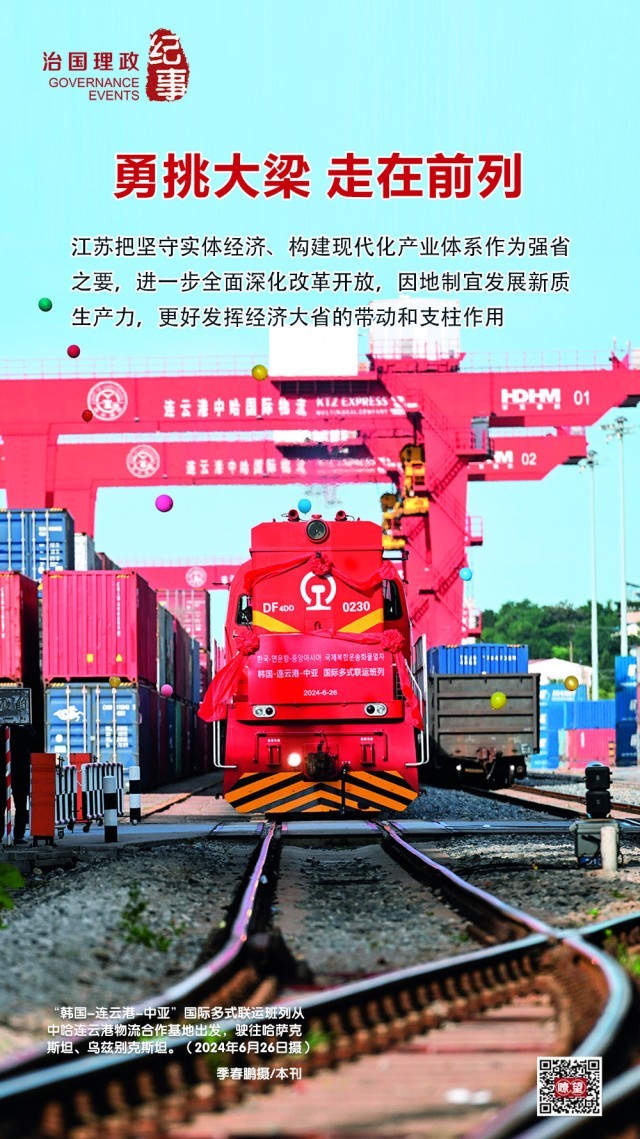 南京、徐州新开至巴库跨里海国际班列,中哈(连云港)物流合作基地实现远洋干线、深水海港、国际班列等互联贯通……作为“一带一路”交汇点,江苏积极推动长江经济带发展和共建“一带一路”融合。2024年,江苏开行中欧(亚)班列2286列、同比增长7.7%,对共建“一带一路”国家进出口占比提升至47.5%。