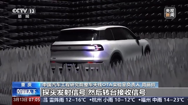 中国汽车工程研究院整车天线OTA实验室负责人 周丽铃:这里是我们的一个探头,然后配我们的转台,探头发射信号,然后转台接收信号,这样的话就可以测汽车的接收性能,那它们互换一下就可以测汽车的一个发射的性能。