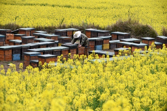 肇兴侗寨村民在油菜花田里养蜂。新华社记者 杨文斌 摄