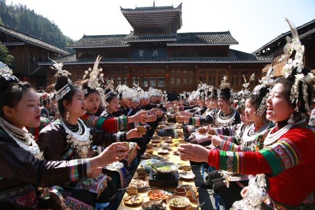 侗族群众围坐一起吃长桌宴。杨代富 摄