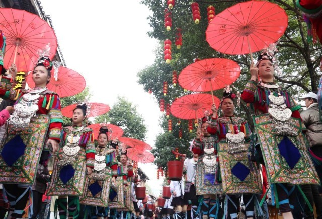 肇兴侗寨侗族群众盛装参加侗年巡游。杨代富 摄