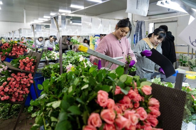 3月16日,在云南省楚雄彝族自治州姚安县,工作人员在姚安毅云花卉有限公司分拣包装车间内包装鲜花。