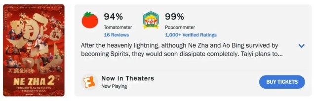 不仅打破了多项票房纪录,《哪吒2》更以IMDb评分8.2分、烂番茄新鲜度94%、爆米花指数99%的口碑,让世界看见中国电影的工业实力与文化魅力。