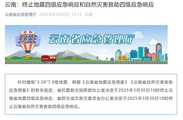 央视网消息:据云南省应急管理厅微信公众号消息,针对缅甸“3·28”7.9级地震,根据《云南省地震应急预案》《云南省自然灾害救助应急预案》的有关规定,云南省抗震救灾指挥部办公室决定于2025年3月30日10时终止云南省地震四级应急响应,云南省防灾减灾救灾委员会办公室决定于2025年3月30日10时终止云南省自然灾害救助四级应急响应。