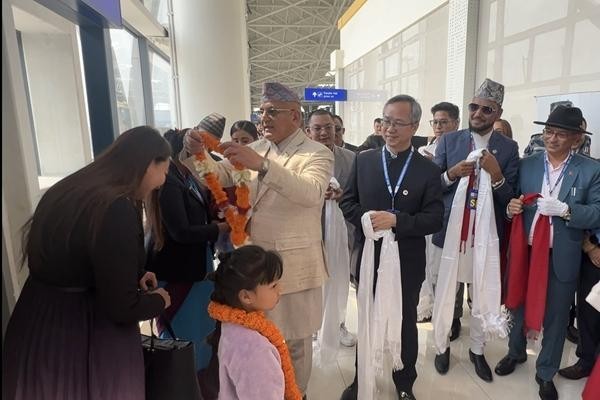 作为共建“一带一路”倡议下中国、尼泊尔互联互通的新成果,拉萨至博克拉首条直飞航线开通。当地时间3月31日,喜马拉雅航空H9731航班由拉萨贡嘎国际机场飞抵尼泊尔博克拉国际机场,中、尼嘉宾向抵达旅客献上花环和哈达。视觉中国供图