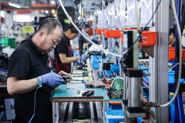 3月26日,在位于嘉兴南湖区余新镇的浙江亚特电器股份有限公司生产车间,工作人员对出口的园林工具进行组装。新华社记者 徐昱 摄
