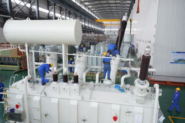 4月1日,在浙江白云浙变电气设备有限公司,工作人员在厂房装配22万伏特高压油浸式变压器。该公司输变电设备出口全球,一季度产值达2.2亿元。新华社记者 翁忻旸 摄