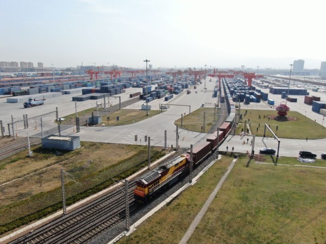 3月21日,满载货物的X8489次中欧班列从西安国际港站驶出(无人机照片)。新华社记者 李一博 摄