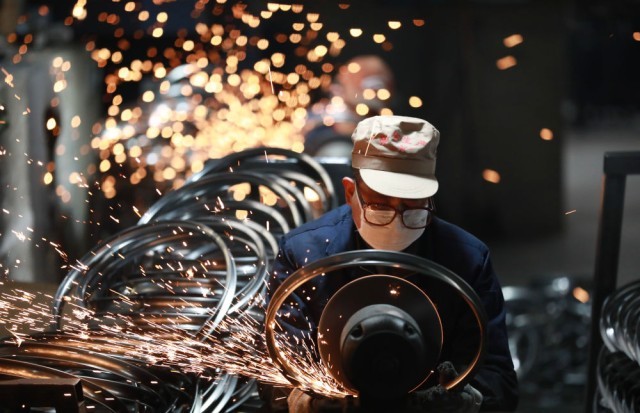 2月11日,在浙江省杭州市临安区天目山镇一家外贸企业,工人在对准备销往海外的自行车钢圈进行抛光作业。新华社发(胡剑欢 摄)