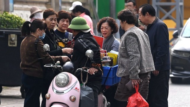 1月8日,游客在东兴口岸附近向来自越南的商贩购买商品。新华社记者 张爱林 摄