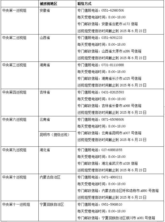 巡视期间,各中央巡视组均设立专门值班电话、专门邮政信箱,受理群众来信来电来访。