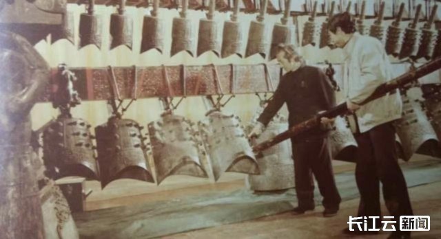(1978年曾侯乙编钟出土后的演奏彩排。穿黑色衣服的是当时中国音乐研究所所长黄翔鹏,右边持棒敲钟者为时任湖北省博物馆副馆长冯光生。资料照片)
