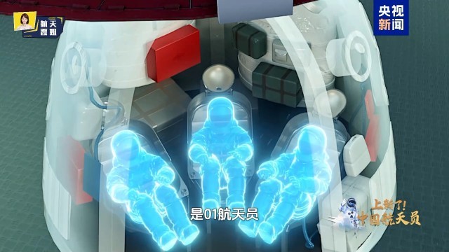 崔霞:接下来,我们的航天员就要进入轨道舱里了。您知道航天员是怎么进入飞船里的吗?肯定不是随机坐的,首先进入飞船的是03航天员,他会坐在舱体的左手边;接下来是02航天员,坐在舱体的右手边;最后进去的是01航天员。所以最后一个进入返回舱的,一定是这次任务的指令长。