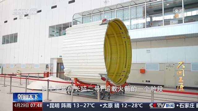 中国航天科技集团一院主任工艺师 刘争:这个是我们长征二号F运载火箭的一个舱段,我们的火箭为了提高它的运载能力,都采用这种薄壁的设计结构,它的直径有3米35,但是壁厚只有1毫米左右,所以它缩比以后比一个鸡蛋壳还要薄。