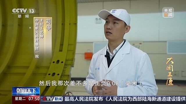 中国航天科技集团一院主任工艺师 刘争:那个数据是100%合格,而且精度很高,我们以前呢,要加工好几次才能保证这个精度正负0.15毫米,然后我那次差不多是正负0.08毫米,将近提高了一倍吧,而且是一次加工完成。