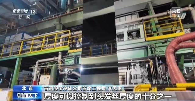 首钢股份冷轧公司首席工程师 李凤惠:锌层厚度均匀性从原来的90%,基本上提高到99.9%,厚度可以控制到头发丝厚度的十分之一。