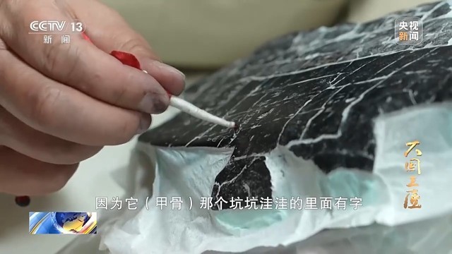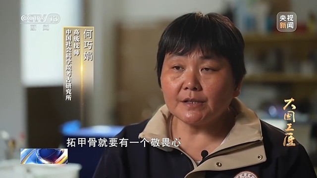 中国社会科学院考古研究所高级技师 何巧娟:因为它太脆了,弄不好就会伤到甲骨。太用力上墨会出现墨疙瘩,要是手劲轻了,甲骨文上的笔道又拓不清楚。拓甲骨要有敬畏心,因为保护甲骨就是保护历史。