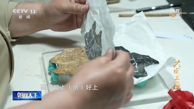 中国社会科学院考古研究所高级技师 何巧娟:那个绿松石看着就要掉出来了,又不能使劲。如果上纸太紧,它就会把绿松石带出来,如果太松,一上墨纸就带起来了。它的背面带着原来的土,所以没法固定,它是凹形的,上完纸马上就得上墨,心、眼、手都要一致,才能做得出来。