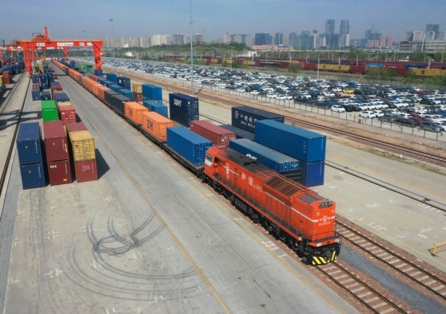 2025年4月15日,X8003次中欧班列(郑州)停靠在国铁集团郑州局圃田车站(无人机照片)。新华社记者 李嘉南 摄