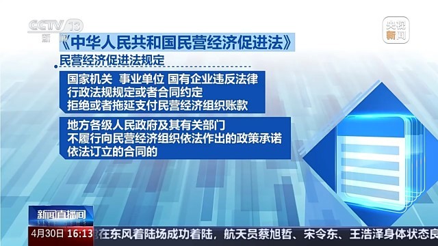 全国人大常委会法工委经济法室主任 杨合庆:强化行政执法监督,坚决遏制“乱收费、乱罚款、乱检查、乱查封”等行为,对高效便利办理涉企事项、完善人才激励政策、健全信用修复制度、健全纠纷多元化解机制、发挥行业协会商会作用、加强海外综合服务和权益保护等作出规定。