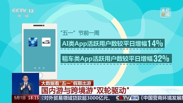 王学建告诉记者,大数据发现,用AI做出行规划、租车自驾等个性化出游成为新亮点。节前一周,AI类、租车类App活跃用户数较平日增幅分别为14%、32%。此外,骑行类App较平日增幅27%。对国际漫游数据的分析显示,节前一周国际漫游业务订单量同比增长51%。来自中国航信数智平台的信息也显示,“五一”假期民航出行市场整体热度将创历史新高,预售出票量是去年同期的122%。预计整个假期期间,旅客量同比增幅达到7%,行业客座率增幅乐观。