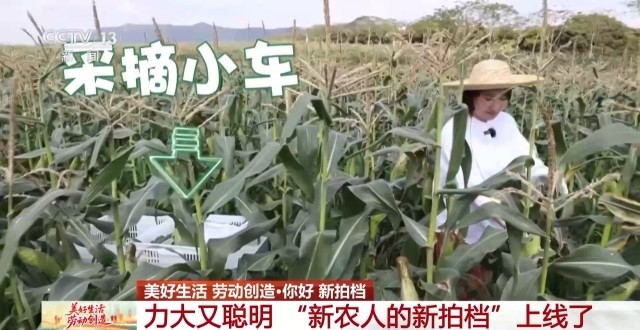 玉米采摘工人:首先体力活没那么重,如果人工背,大概要五六十斤,这样我们就不用背了,采摘就行了。快很多,轻松很多,干得很开心。