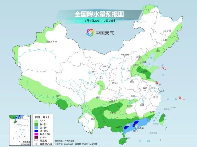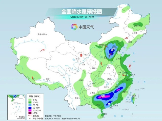 预计,5月8日20时至9日20时,广西北部、广东西部和中北部、江西东部和南部、福建西部、浙江南部、江苏南部以及华北东北部等地部分地区有大到暴雨,其中,广西东北部、江西东部、湖南南部等地部分地区有大暴雨。