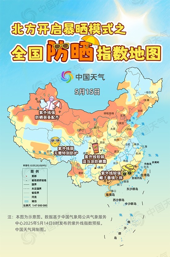 中国天气网讯 随着高温季开启,容易晒黑的时节又来了!未来四天(5月15日至18日),北方多地持续晴热天气,部分地区还将开启“暴晒”模式,尤其是午后紫外线较强,“美黑”服务可能分分钟上线。中国天气网贴心推出全国防晒指数地图,看看你的城市需要几级防晒装备。