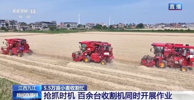 位于江西省九江市柴桑区的江洲镇今年种植小麦5.5万亩,占九江市小麦种植面积的三分之一。眼下那里的小麦已经成熟,为了抢抓晴好天气,当地积极组织机械收割。