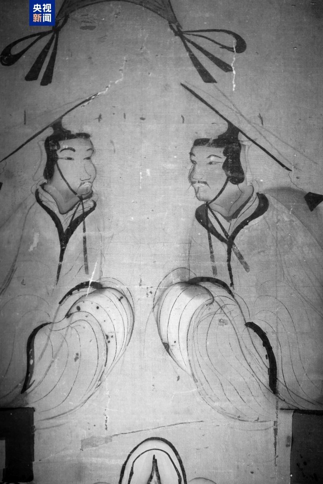 一处改绘痕迹出现在T形帛画上部:这里描绘着天国大门左右两边,有两位天国守门神,拱手而坐,迎接墓主人灵魂升入天国。高光谱影像显示出,两位守门神的手部,有手握玉圭的线条痕迹,应为绘制帛画的匠人画的底稿,后来改动,把手部动作画成拱手状。