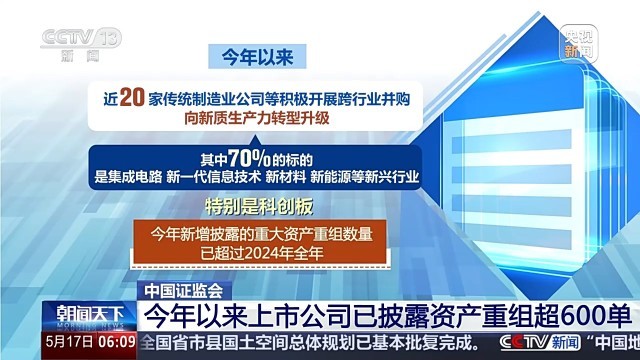 记者从中国证监会了解到,《关于深化上市公司并购重组市场改革的意见》,也就是“并购六条”发布近8个月以来,并购市场活跃度明显提升,沪深两市已披露资产重组超1400单,其中重大资产重组超160单。