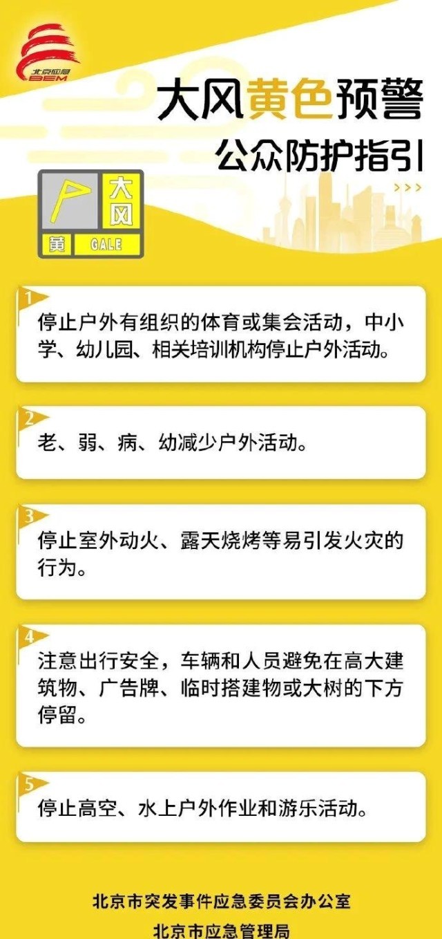 大风预警期间,市民出行需注意防风防火和交通安全,远离广告牌等临时搭建物,谨防高空坠物。停止高空、水上户外作业和游乐活动。