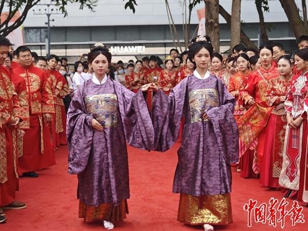 本报重庆5月17日电(中青报·中青网记者 耿学清)今天,一场专属于青年的集体婚礼盛典在重庆市大渡口区举行,54对新人在充满中华传统文化特色与青春创意的婚礼中“牵手团缘、青春偕进”。