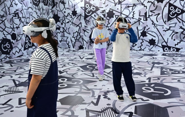 4月26日,小朋友们在第三届中国(安徽)科技创新成果转化交易会上体验VR设备。新华社记者 周牧 摄