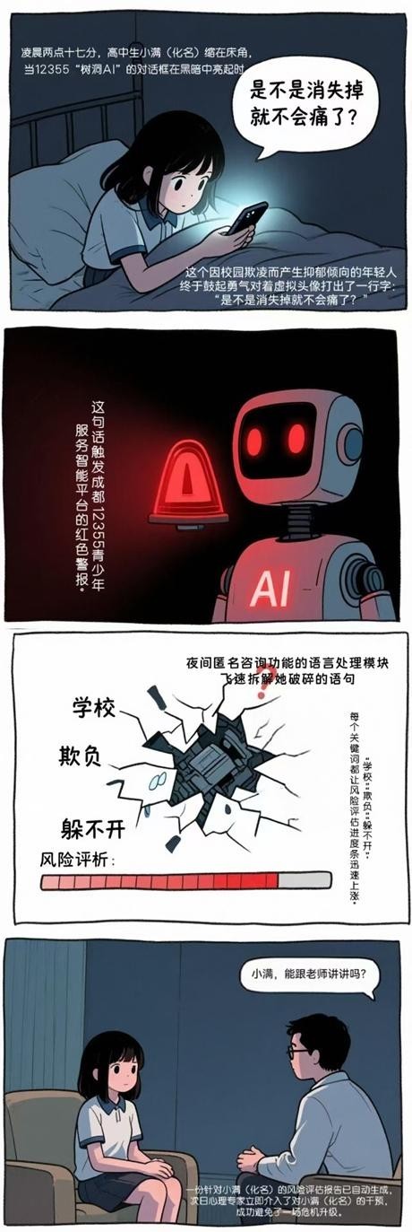 中青报·中青网记者在采访中发现,这样一次数字化的实践,不仅是服务工具层面的一次大胆创新,更如一面折射时代困境与人文关怀的棱镜。成都通过科技赋能构建“机器人+人工+专家”运行模式,在青少年心理健康服务数字化领域里持续探索。