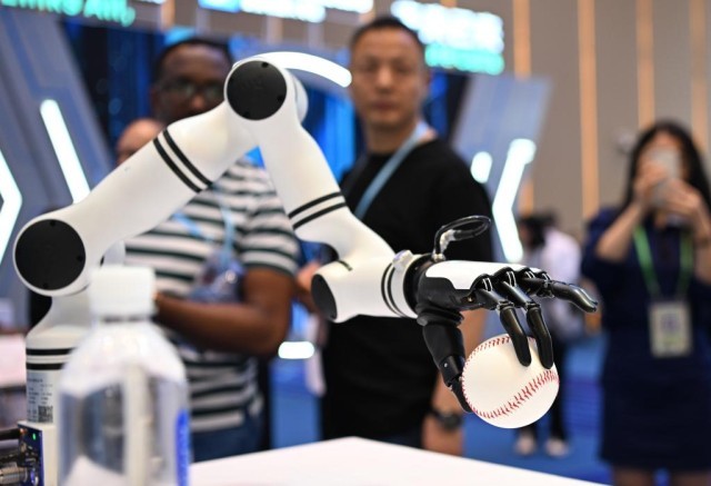 2025年4月15日,在第137届广交会服务机器人专区,机械臂展示灵巧手功能。新华社记者 邓华 摄
