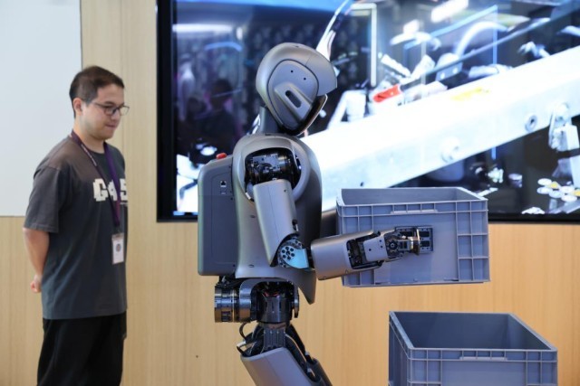4月23日,在深圳优必选科技展厅内,工业人形机器人Walker S演示搬运物品。新华社记者 梁旭 摄