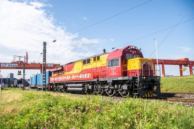 4月20日上午,一列满载“重庆造”聚酯切片的中亚班列,从重庆团结村中心站缓缓驶出,这是重庆首次开行图定中亚班列,此后将以每月2列的固定频次实现常态化开行。新华社记者 唐奕 摄