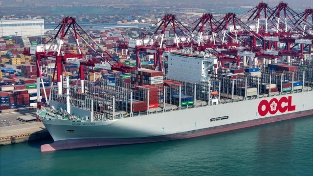 4月30日,货运卡车在青岛港前湾集装箱码头接送集装箱。新华社记者 李紫恒 摄