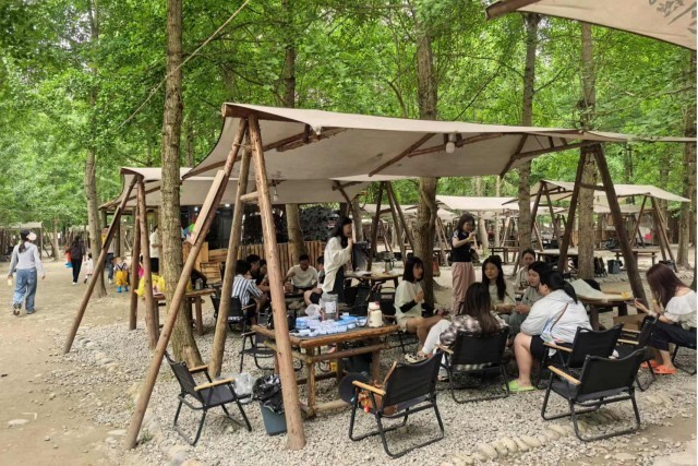 “‘露营经济’是我们的发展方向,定位是大城市周边游,辐射人群主要为城市里的家庭客户,经营模式为‘一价全包’。”“长河落日园”森林营地负责人张英杰介绍,客户所购买的入园门票涵盖了营地内的吃、喝、娱、游,既满足了大人“躺平式遛娃”的需求,也让小朋友体会到了“乡下的童年”。