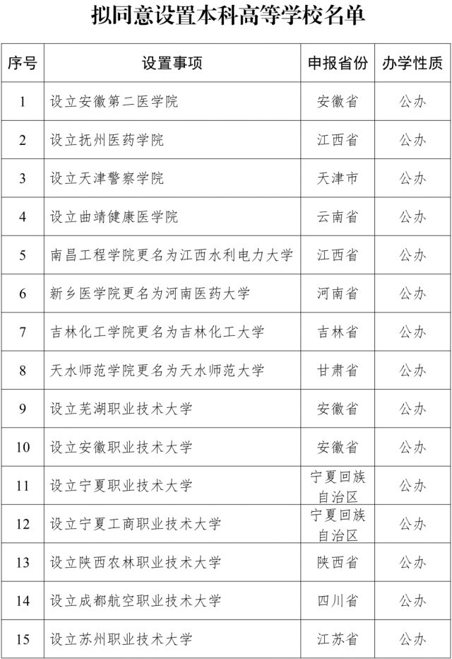 根据《中华人民共和国高等教育法》《普通高等学校设置暂行条例》《普通本科学校设置暂行规定》《本科层次职业学校设置标准(试行)》等有关规定以及第八届全国高等学校设置评议委员会考察评议结果,经教育部党组会议审议,拟同意设置安徽第二医学院等32所学校,现予公示。
