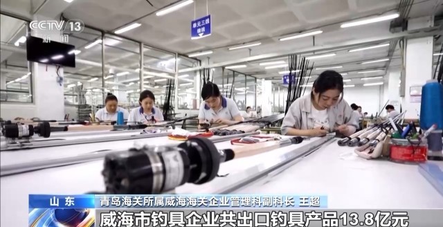 青岛海关所属威海海关企业管理科副科长 王超:威海渔具规模化、专业化的产业集群让企业“出海”的勇气更足。今年1—4月,威海市钓具企业共出口钓具产品13.8亿元,同比增长19.6%。
