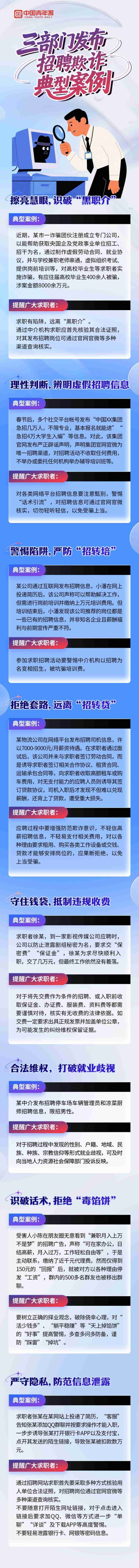为加强风险防范,人力资源和社会保障部、中央网信办、教育部5月23日联合发布招聘欺诈典型案例,揭示不法分子的惯用手法和话术套路,帮助高校毕业生等广大求职者提高风险识别意识,增强自我保护能力。