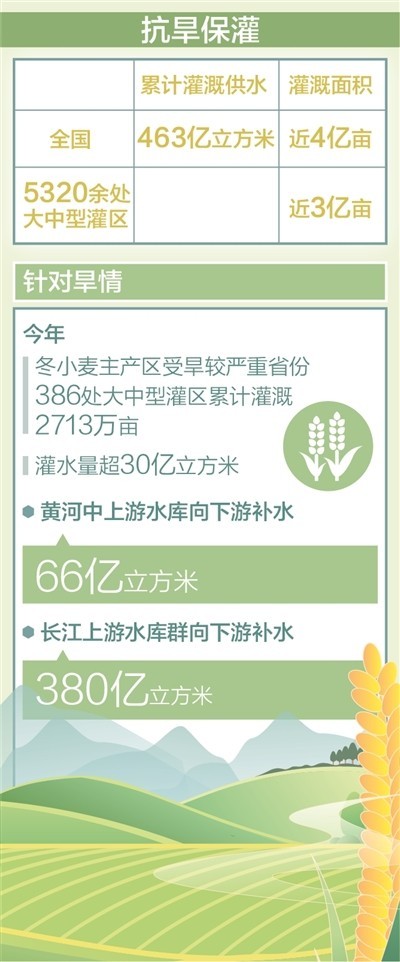 本报北京5月24日电 (记者李晓晴)记者从水利部获悉:春灌已近尾声,全国累计灌溉供水463亿立方米,灌溉面积近4亿亩;5320余处大中型灌区充分发挥抗旱保灌主力军作用,累计灌溉面积近3亿亩,为保障夏粮丰收提供了支撑。今年冬小麦主产区受旱较严重的河南、陕西、山西等省份386处大中型灌区累计灌溉2713万亩,灌水量超30亿立方米。
